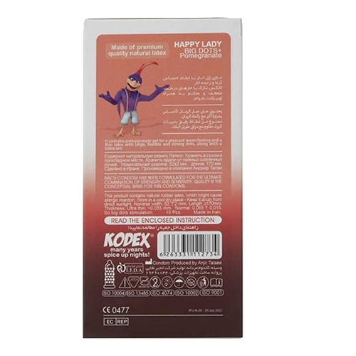 کاندوم خاردار انار هپی لیدی کدکس با داشتن اسانس انار و خارهای درشت یک رابطه لذت بخش را برای زوجین فراهم می‌کند. این کاندوم از جنس لاتکس ضد حساسیت است و در بسته ۱۰ عددی شما می‌توانید آن را تهیه کنید. وجود ژل انار در کاندوم هپی لیدی برند کدکس با خاصیت تنگ‌کنندگی و ایجاد احساس گرما تجربه‌ای متفاوت برای زوج‌ها فراهم می‌کند. در ساخت این کاندوم از لاتکس فوق‌العاده نازک و مقاوم استفاده شده است تا آقایان بدون احساس ضخامت یا کاهش تماس، گرما و لذت طبیعی را به‌خوبی حس کنند. از سوی دیگر، وجود عصاره انار طبیعی در ترکیبات آن موجب تنگ‌تر شدن واژن و افزایش تحریک در خانم‌ها می‌شود. این ویژگی باعث می‌شود دخول با هیجان و لذت بیشتری همراه باشد.
